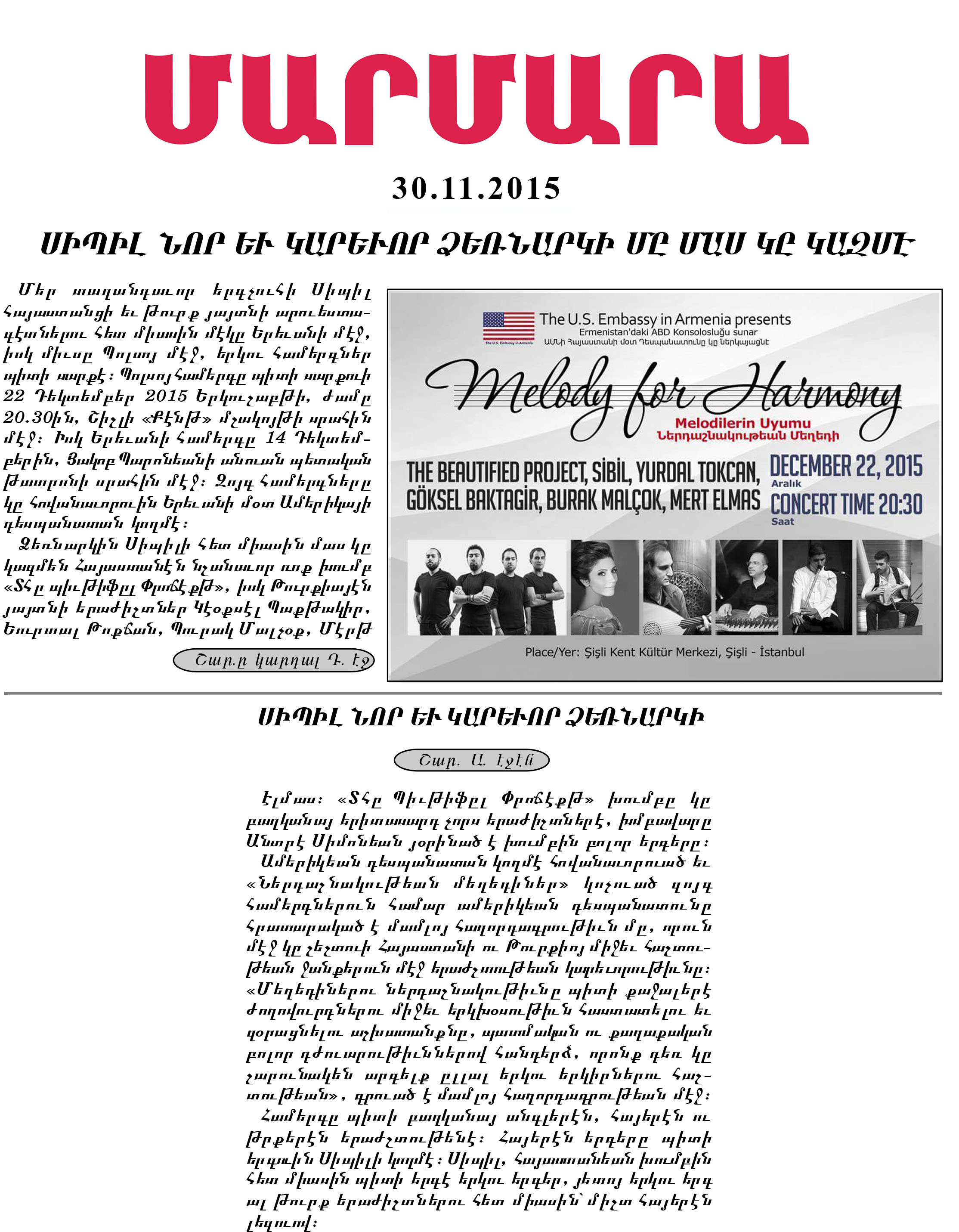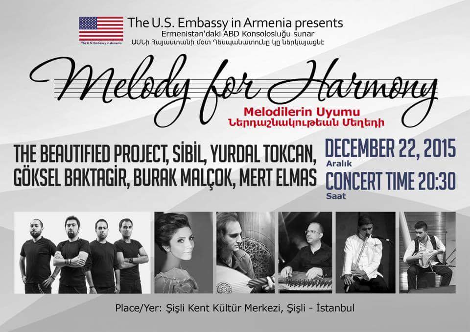 Türkiye ve Ermenistan arasında, müzik aracılığıyla kültürel bir köprü kurmayı amaçlayan "Melodilerin Uyumu" (Melody for Harmony) adlı projesinde Türk ve Ermeni müzisyenleri bir araya getirdi. Ermenistan’ın Amerika Konsolosluğu sponsorluğundaki konserlerden ilki 14 Aralık 2015'te Ermenistan’ın başkenti Erivan’da, ikincisi ise 22 Aralık 2015'te İstanbul'da gerçekleştirildi.