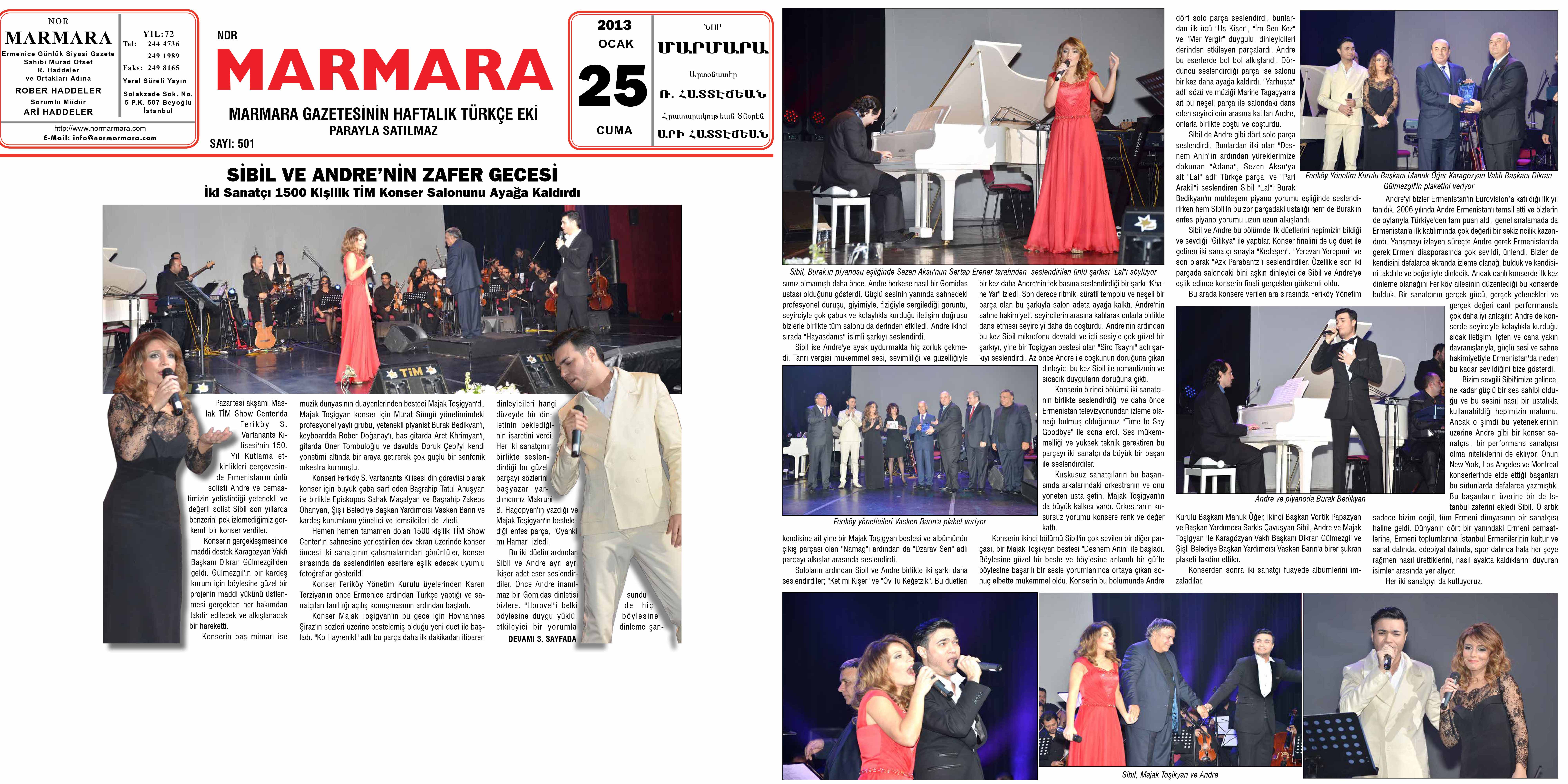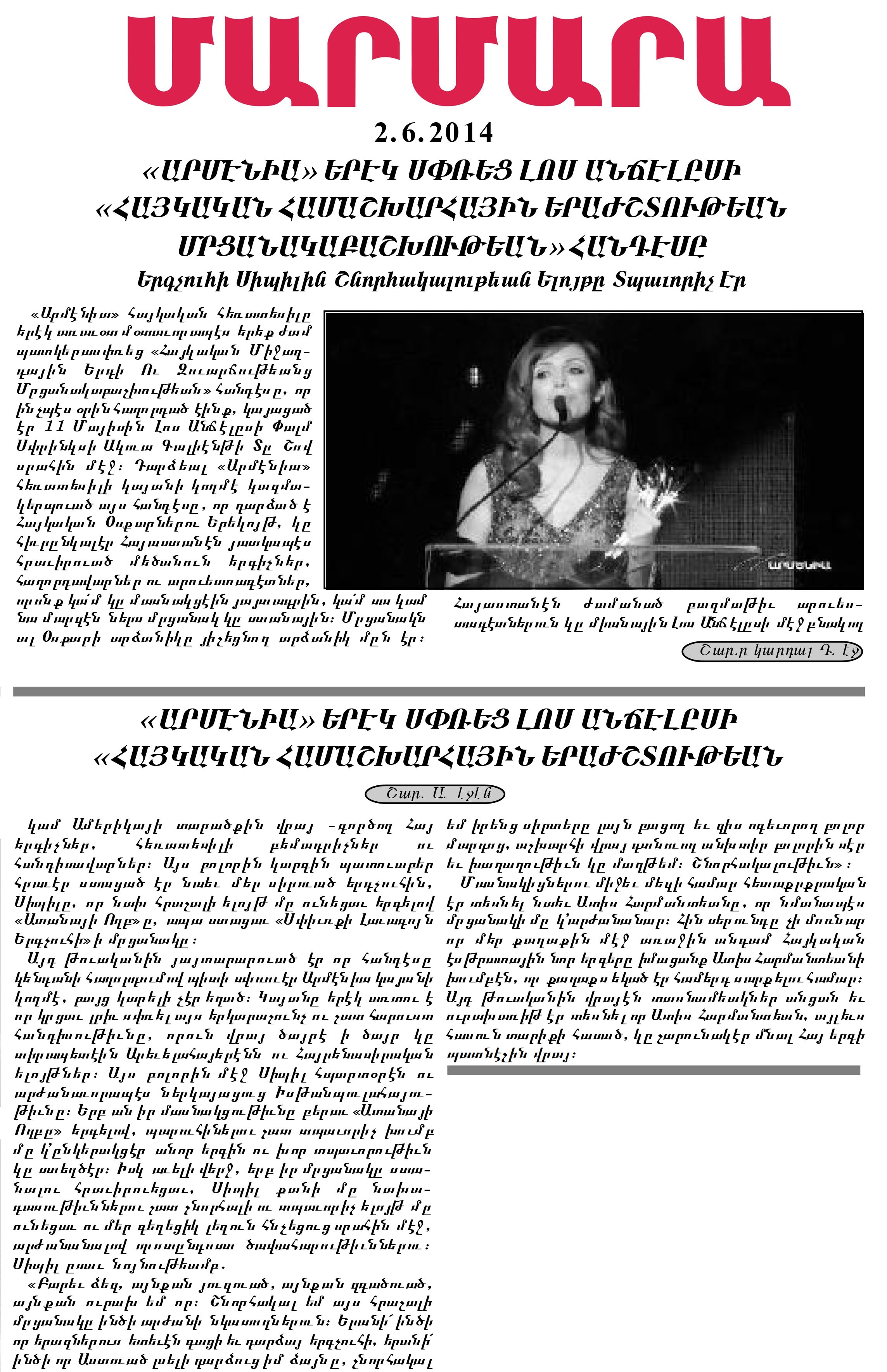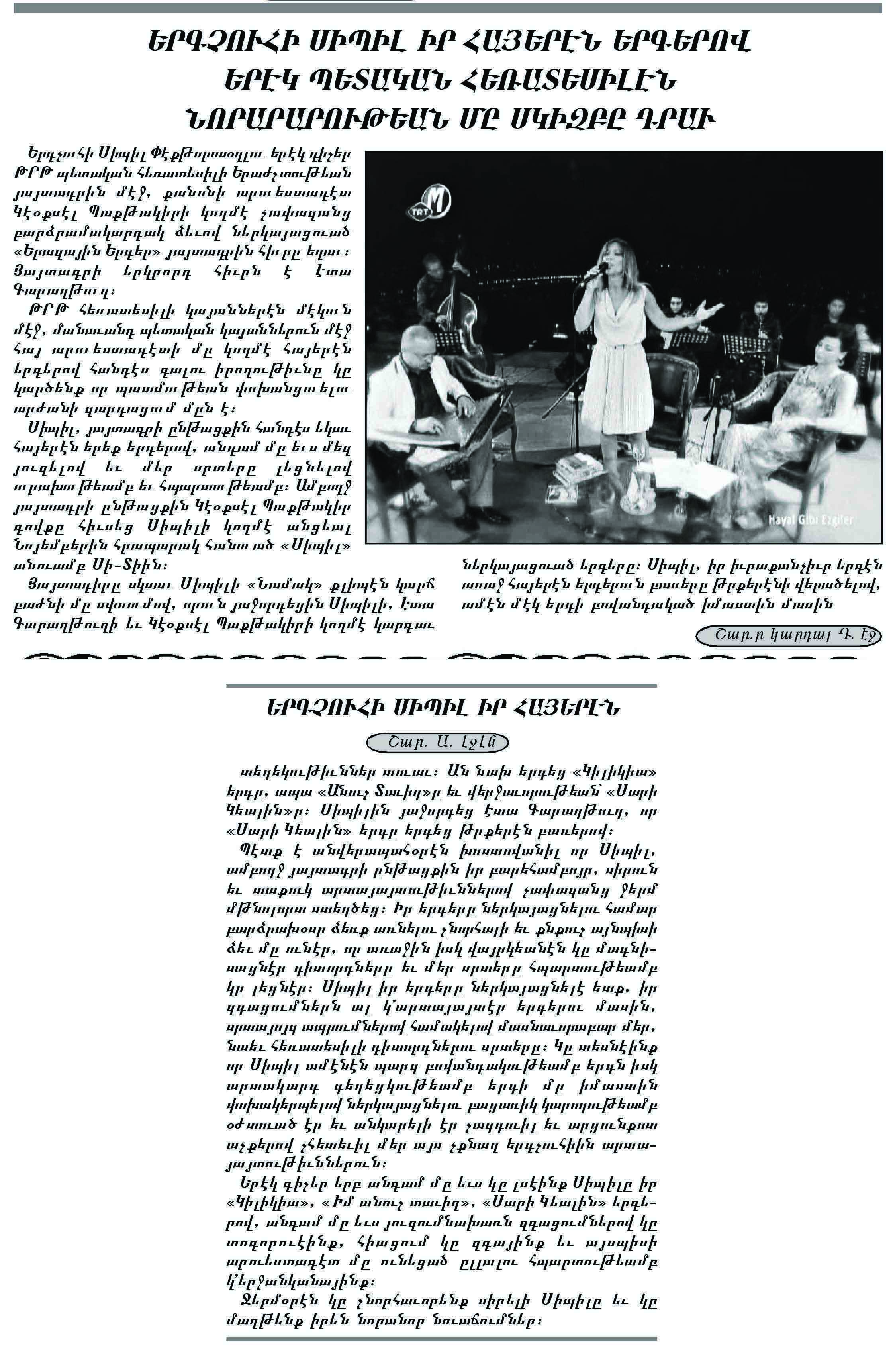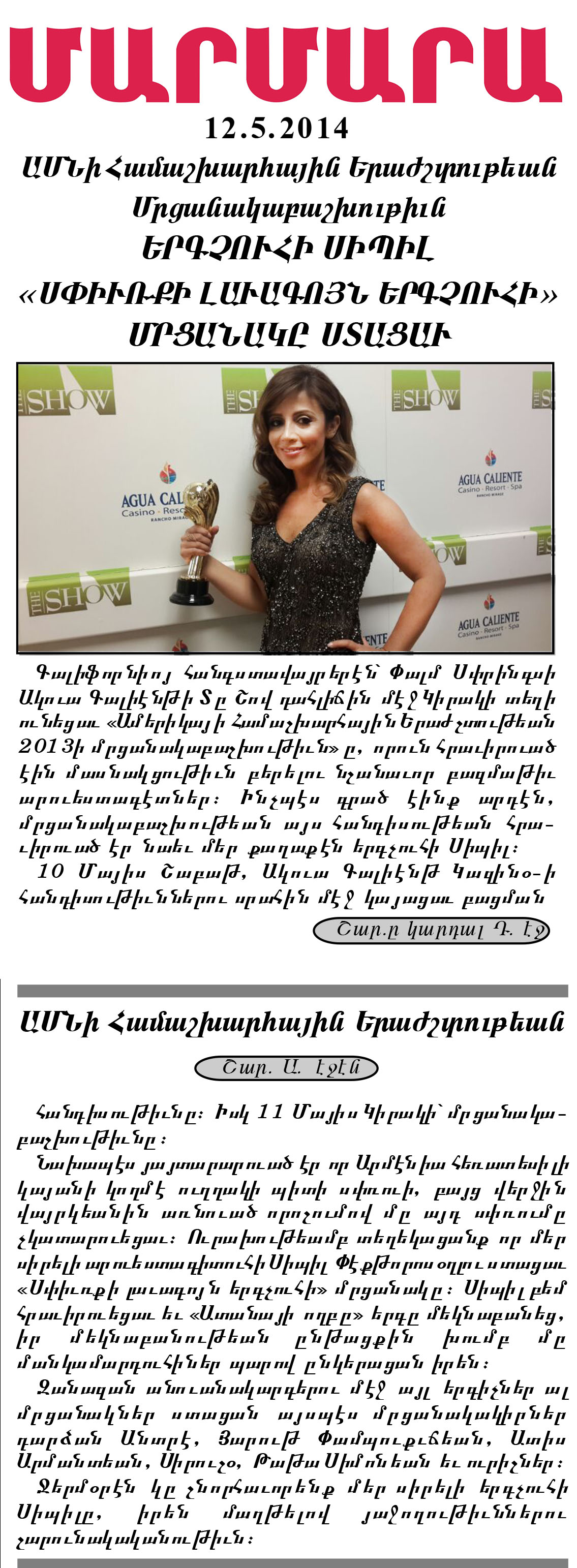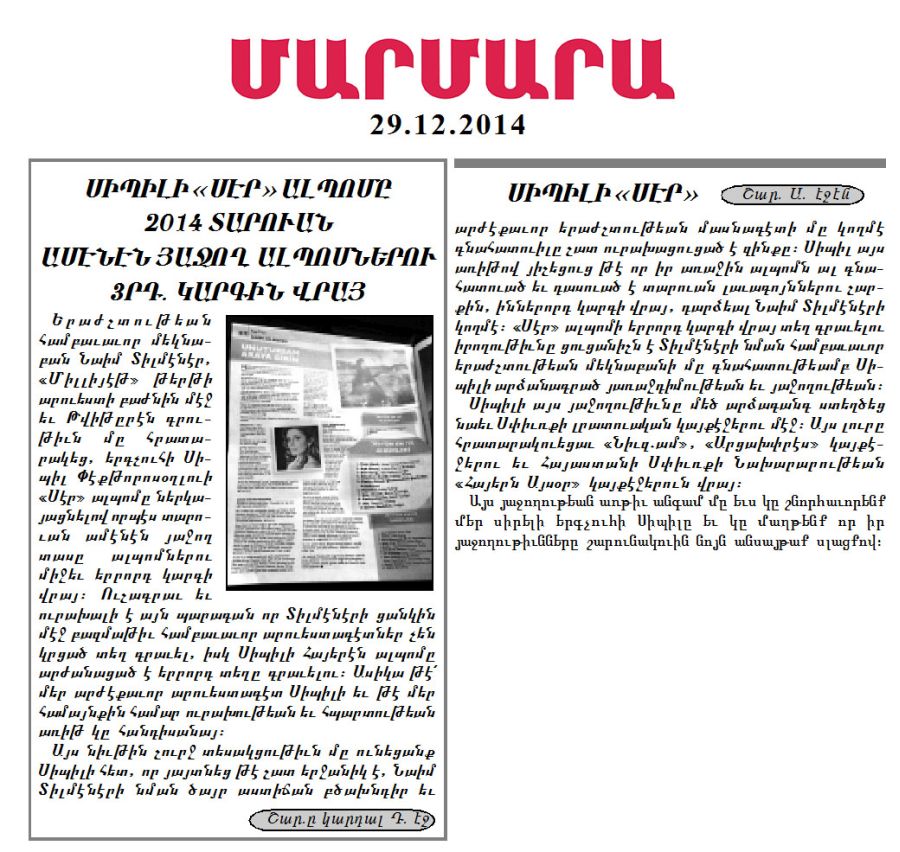 Ağustos 2015’te Ermenistan’ın başkenti Yerevan’da gerçekleştirilen ve ikinci kez davet edildiği Pan-Armenian Olimpiyat oyunlarının açılış töreninde sahneye çıktı. Pan-Armenian oyunlarına sağladığı katkılar sebebiyle Ermenistan Cumhurbaşkanı Serj Sarkisyan tarafından minnet madalyası ile ödüllendirildi.