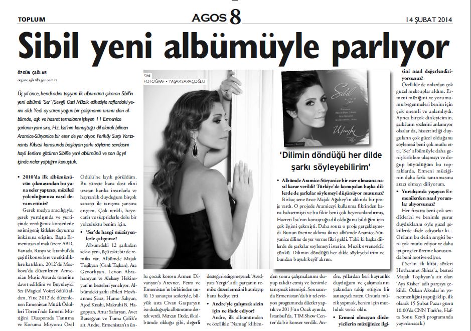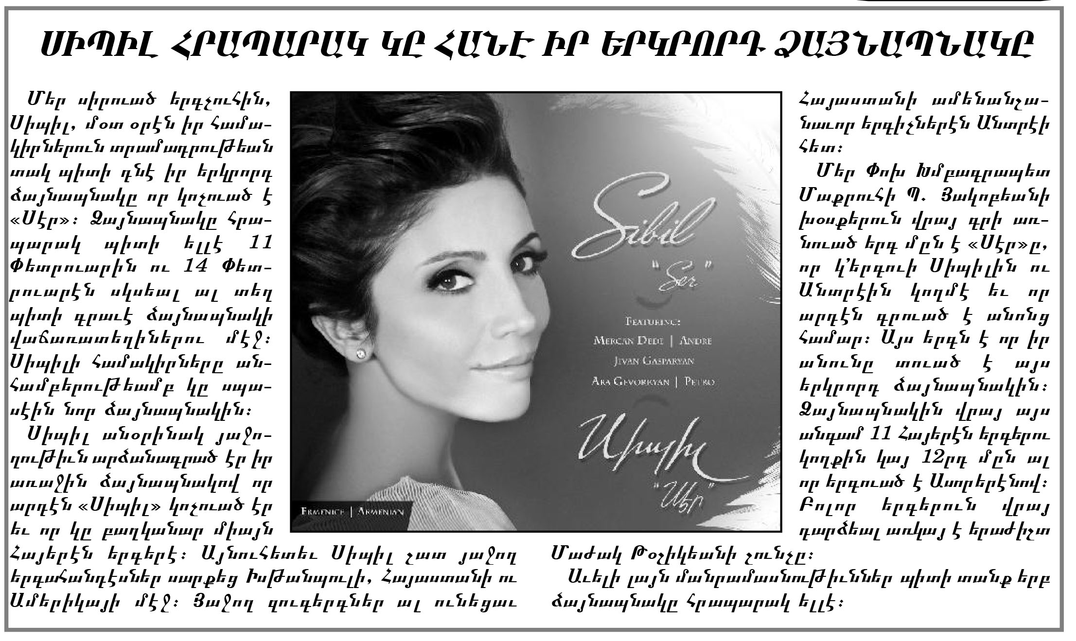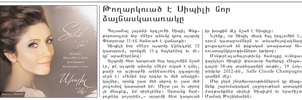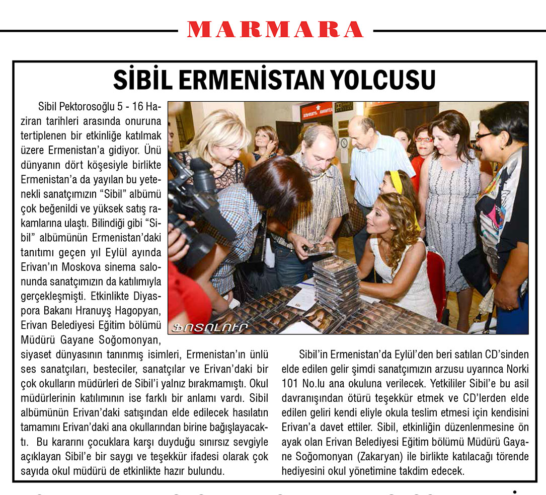 18 Eylül 2014'te Ermenistan’ın başkenti Yerevan’da, belediyenin katkıları ile ''SER'' albümünün tanıtımı yapıldı. Albüm satışlarından elde edilen geliri bir anaokuluna bağışlayan Sibil, yardım çalışmaları ve yaptığı sanatsal katkılar sebebiyle Yerevan’da, Ermenistan Diaspora Bakanı Hranush Hakobyan tarafından “Gomidas madalyası” ve Yerevan Belediye başkanı Daron Margaryan tarafından da “Yerevan Belediyesi altın madalyası” ile ödüllendirildi.